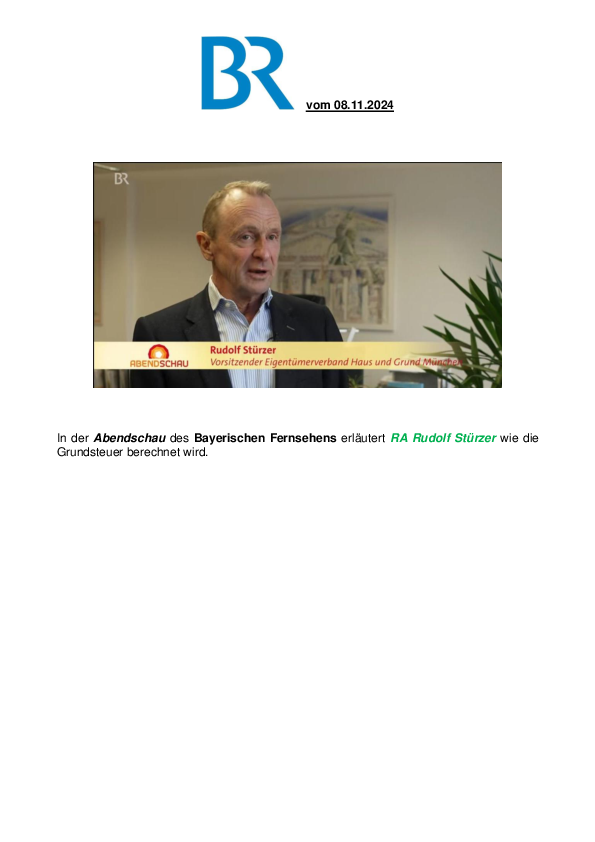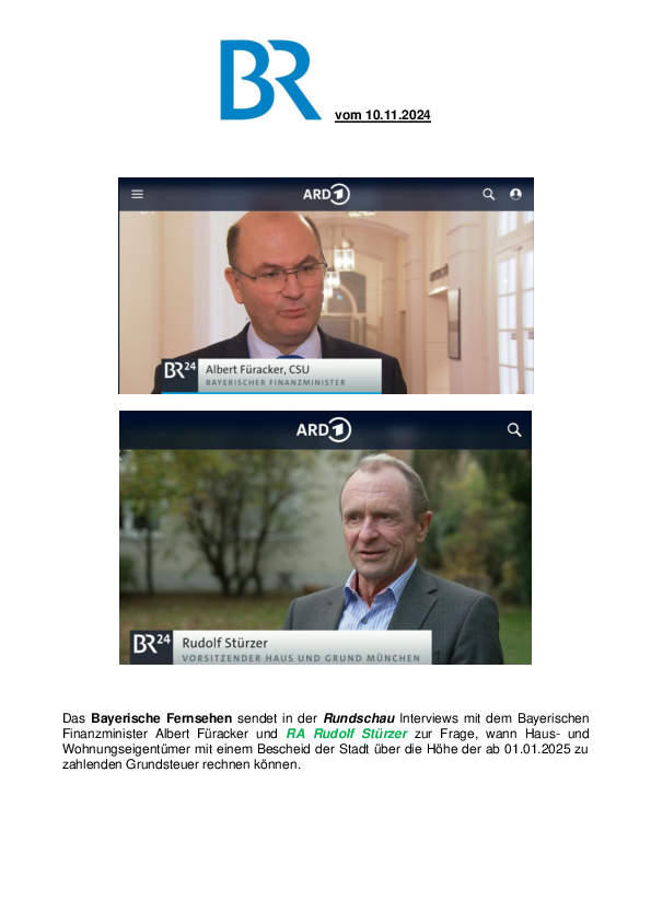 Das Bayerische Fernsehen sendet in der Rundschau Interviews mit dem Bayerischen Finanzminister Albert Füracker und RA Rudolf Stürzer zur Frage, wann Haus- und Wohnungseigentümer mit einem Bescheid der Stadt über die Höhe der ab 01.01.2025 zu zahlenden Grundsteuer rechnen können.