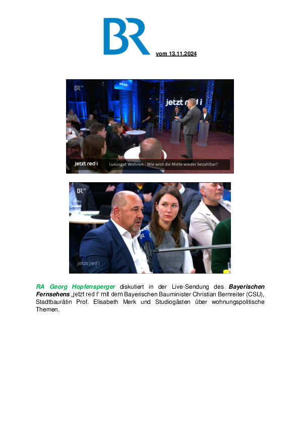 RA Georg Hopfensperger diskutiert in der Live-Sendung des Bayerischen Fernsehens „jetzt red i“ mit dem Bayerischen Bauminister Christian Bernreiter (CSU), Stadtbaurätin Prof. Elisabeth Merk und Studiogästen über wohnungspolitische Themen.
