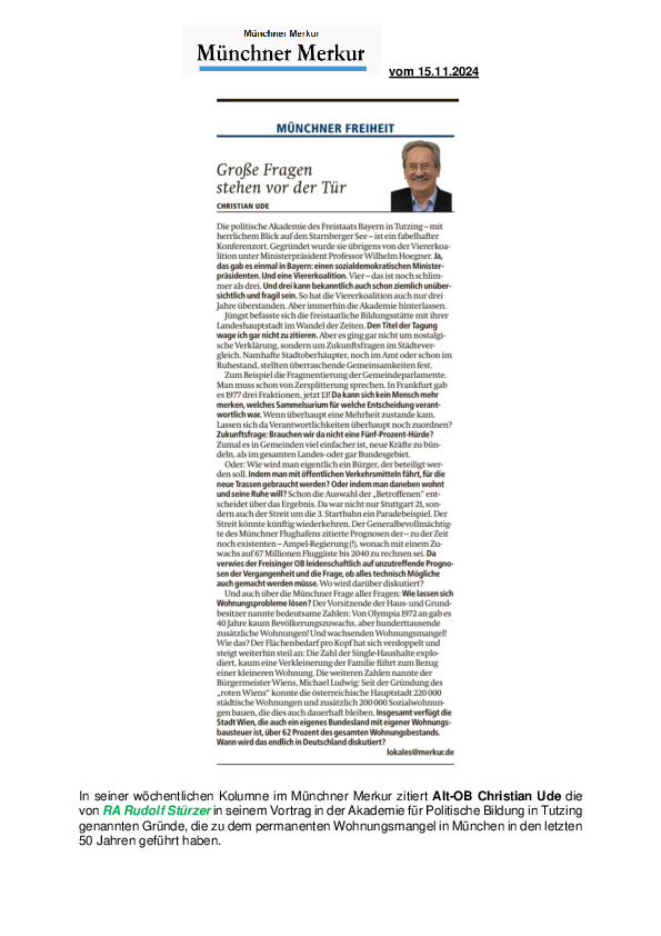 In seiner wöchentlichen Kolumne im Münchner Merkur zitiert Alt-OB Christian Ude die von RA Rudolf Stürzer in seinem Vortrag in der Akademie für Politische Bildung in Tutzing genannten Gründe, die zu dem permanenten Wohnungsmangel in München in den letzten 50 Jahren geführt haben.