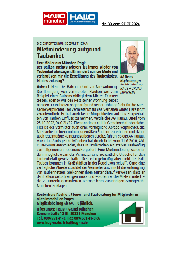 Mietminderung aufgrund Taubenkot
