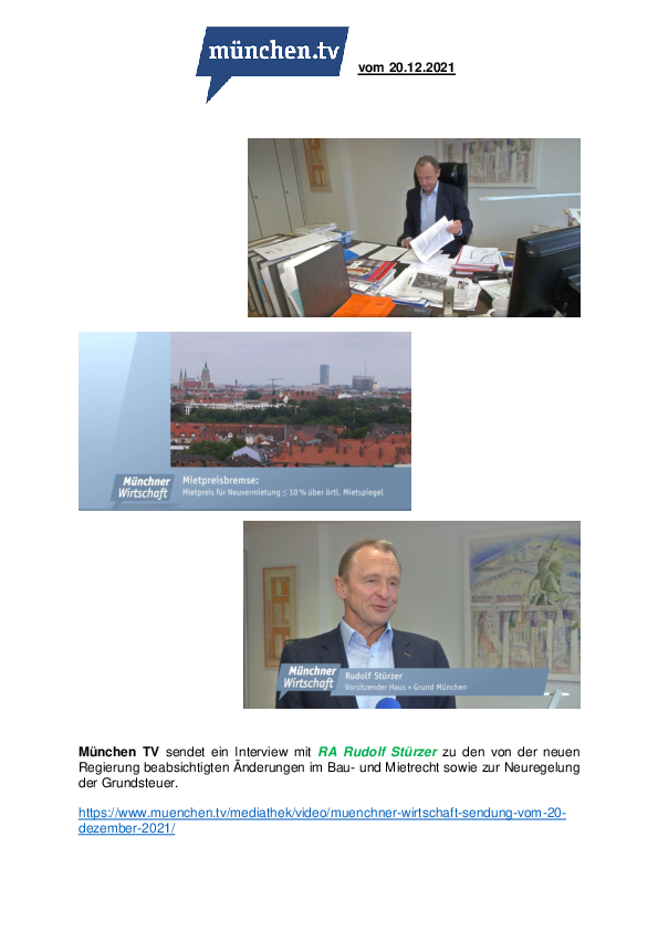 München TV sendet ein Interview mit RA Rudolf Stürzer zu den von der neuen Regierung beabsichtigten Änderungen im Bau- und Mietrecht sowie zur Neuregelung der Grundsteuer.