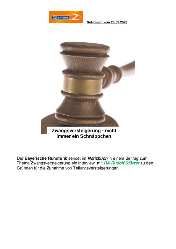 Der Bayerische Rundfunk sendet im Notizbuch in einem Beitrag zum Thema Zwangsversteigerung ein Interview mit RA Rudolf Stürzer zu den Gründen für die Zunahme von Teilungsversteigerungen.