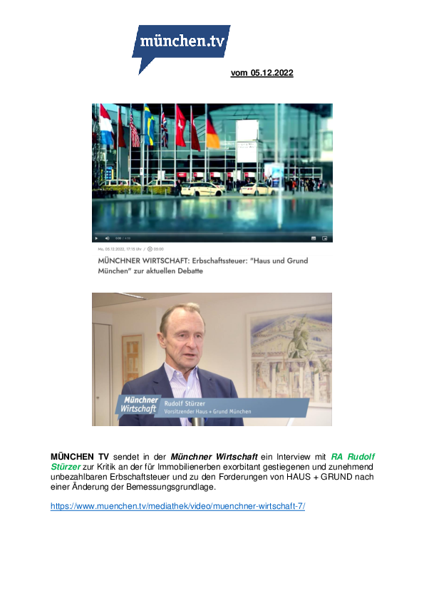 MÜNCHEN TV sendet in der Münchner Wirtschaft ein Interview mit RA Rudolf Stürzer zur Kritik an der für Immobilienerben exorbitant gestiegenen und zunehmend unbezahlbaren Erbschaftsteuer und zu den Forderungen von HAUS + GRUND nach einer Änderung der Bemessungsgrundlage.
