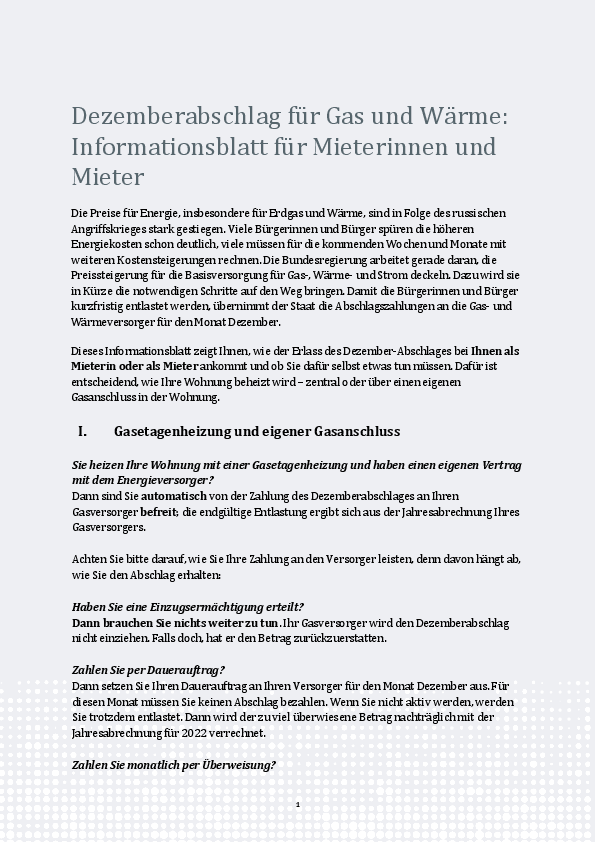 Dezemberabschlag für Gas und Wärme: Informationsblatt für Mieterinnen und Mieter