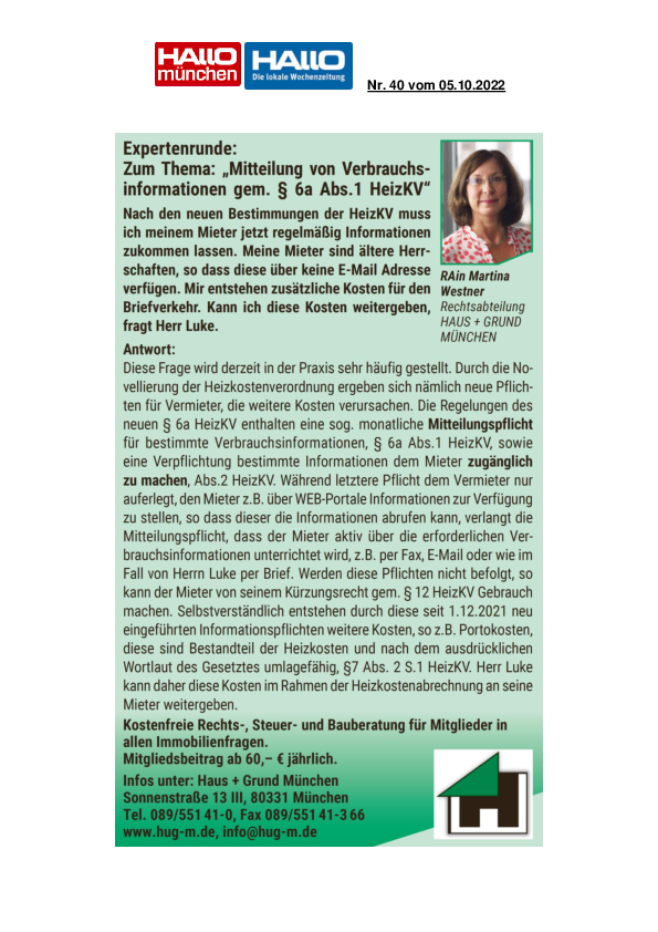 Mitteilung von Verbrauchsinformationen gem. § 6a Abs. 1 HeizKV