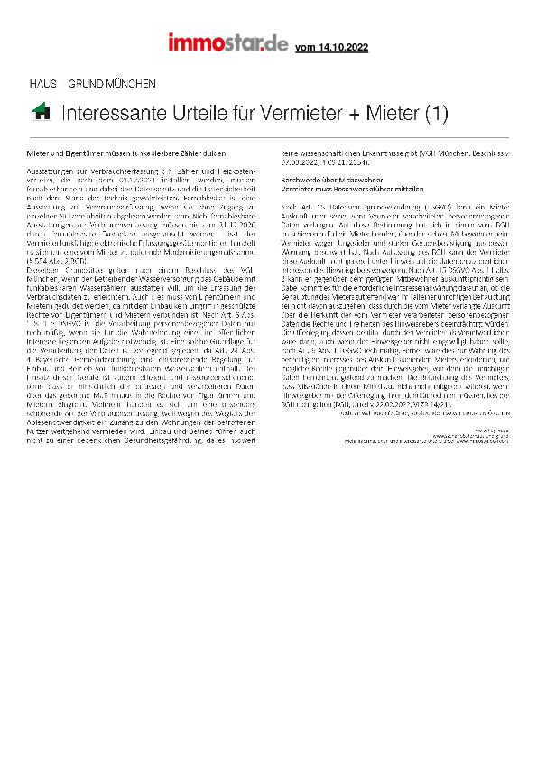Mieter und Eigentümer müssen funkablesbare Zähler dulden // Beschwerde über Mitbewohner – Vermieter muss Beschwerdeführer mitteilen