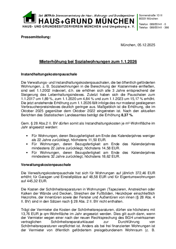 Mieterhöhung bei Sozialwohnungen zum 1.1.2026