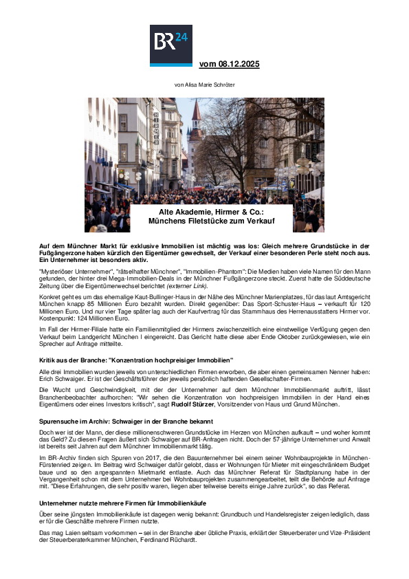 Das Bayerische Fernsehen sendet in der Abendschau anlässlich des Verkaufs des Hirmer-Stammhauses in der Fußgängerzone ein Interview mit RA Rudolf Stürzer zur Problematik der Konzentration von hochpreisigen Immobilien in der Hand eines Investors.