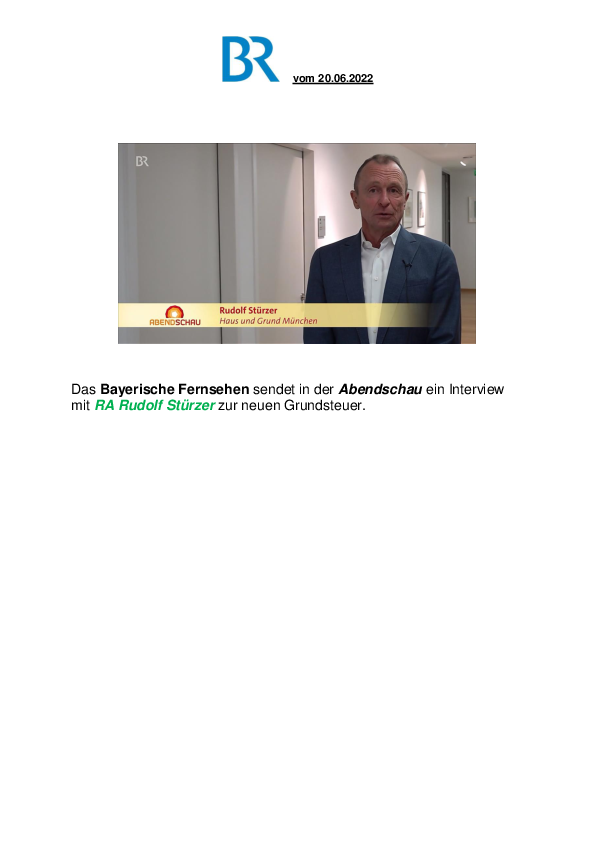 Das Bayerische Fernsehen sendet in der Abendschau ein Interview mit RA Rudolf Stürzer zur neuen Grundsteuer.
